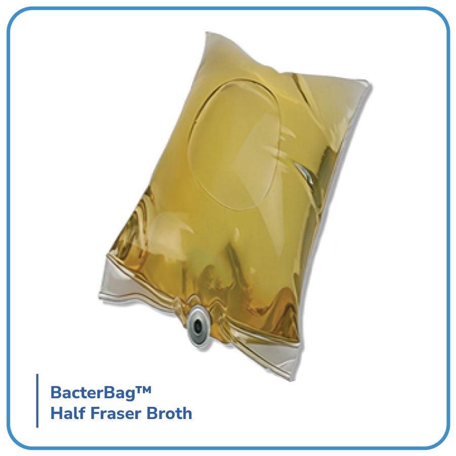 BacterBag™ Half Fraser Broth được sử dụng để tăng sinh chọn lọc và vi phân (canh trường tăng sinh sơ cấp) Listeria monocytogenes và Listeria spp. trong các sản phẩm thực phẩm, theo Tiêu chuẩn NF EN ISO 11290-1.