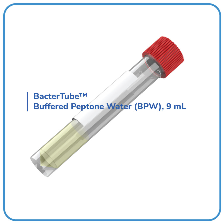 BacterTube™ Buffered Peptone Water (BPW), 9 mL là môi trường được khuyến nghị làm môi trường làm giàu trước các vi khuẩn Enterobacteriaceae như các loài Salmonella và Cronobacterium từ thực phẩm và thức ăn chăn nuôi, nước, sữa, các sản phẩm từ sữa và các sản phẩm khác.
