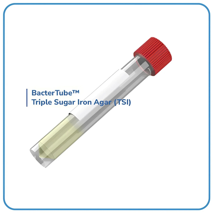 BacterTube™ Triple Sugar Iron Agar là môi trường thực hiện thử nghiệm sinh hóa lên men Glucose, Lactose và sucrose (có hoặc không có tạo khí), phản ứng tạo Hydrogen sulfide và sinh khí để định danh trực khuẩn Gram âm.